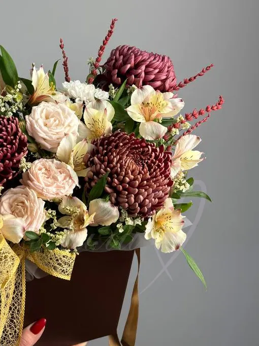 Осенняя композиция с розой, альстромерией и хризантемлй. Каждый цветок словно маленькое солнце, дарящее тепло и радость.