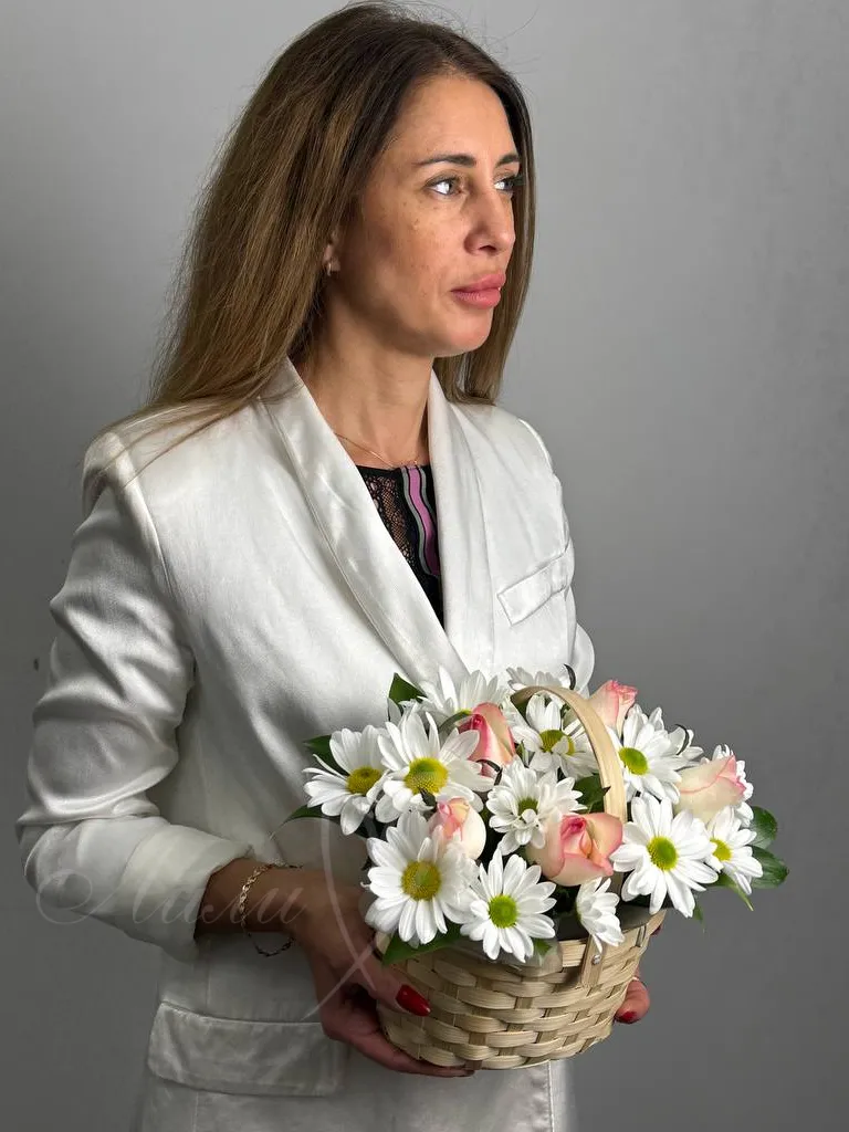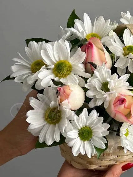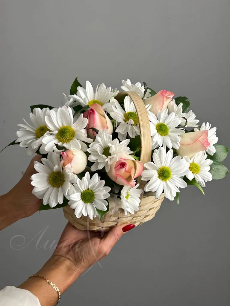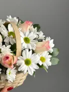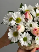 Обворожительная корзина с нежными розами и кустовой хризантемой станет комплиментом для любой девушки.
