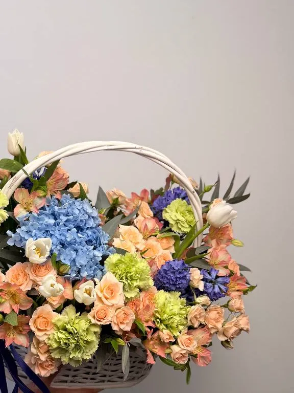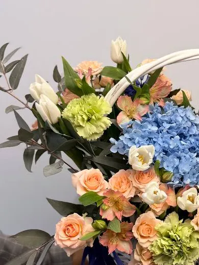 Все филиалыКомпозиция из гортензии, тюльпанов, роз и гвоздик «Престиж»