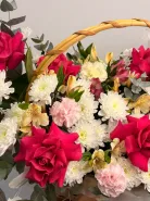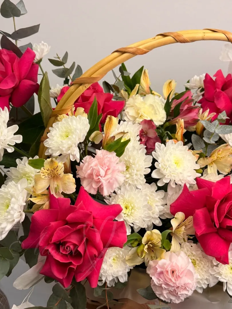 Такая нежная и воздушная корзина из розы, гвоздики и хризантемы.