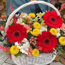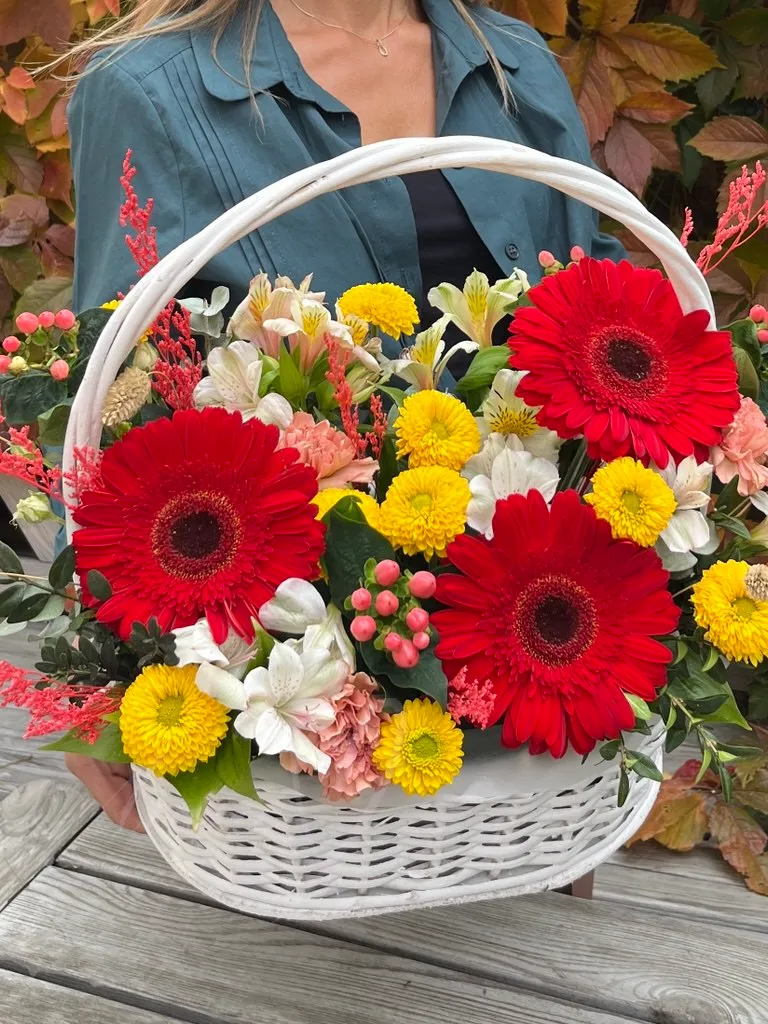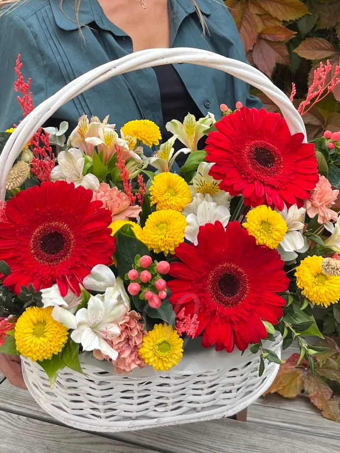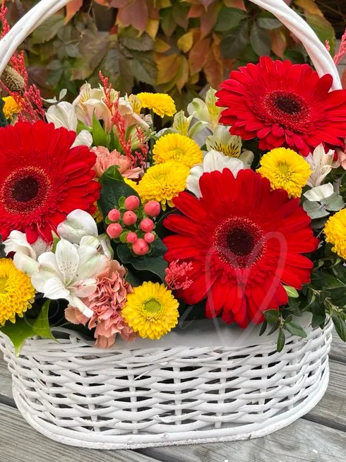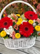Композиция в интересном кашпо в сочетании с хризантемой кустовой , гвоздикой, эустомой, герберами.