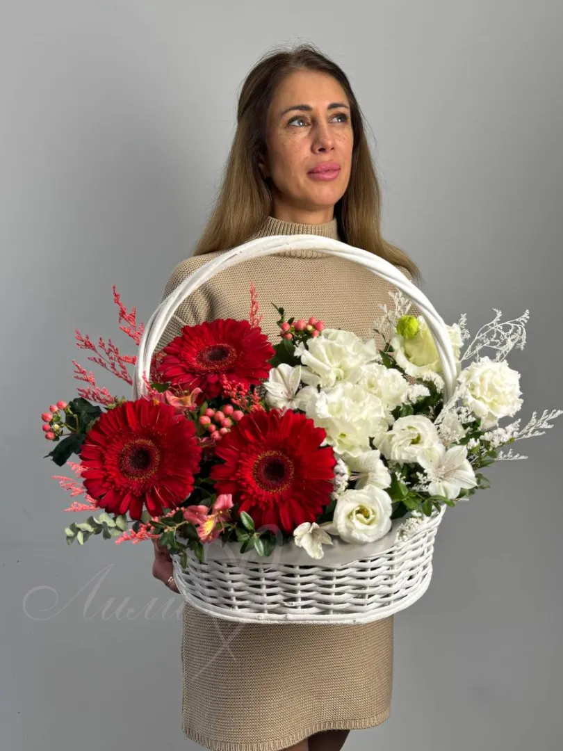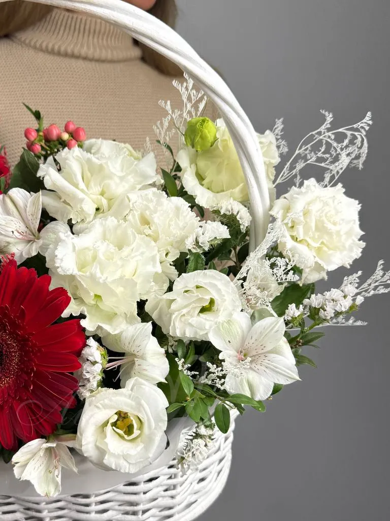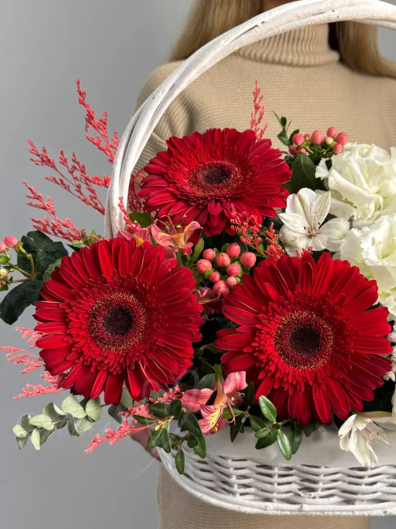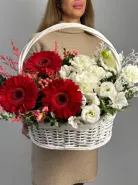 Композиция в корзине в сочетании с эустомой, герберами и зеленью.