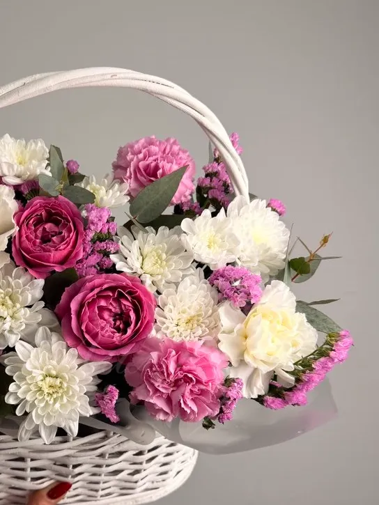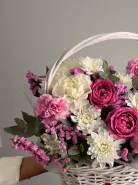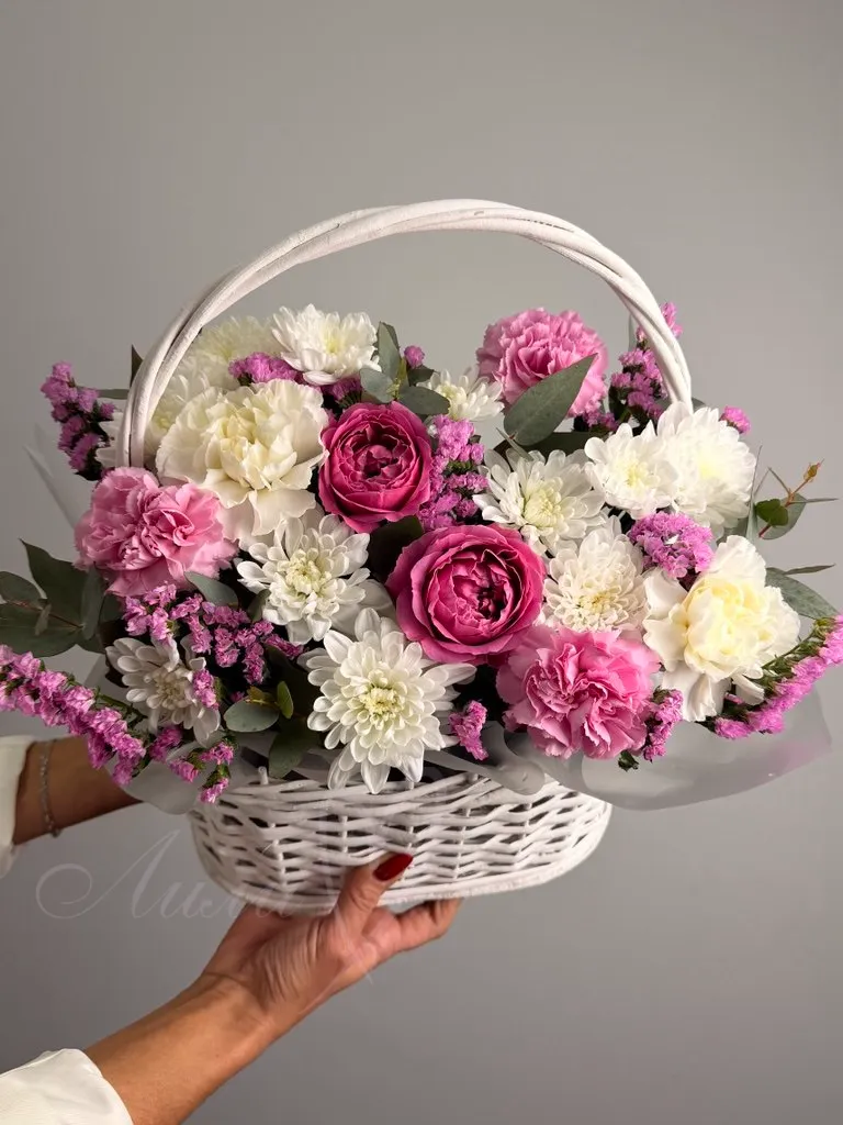 Корзина «Ариэль» — это изысканное сочетание свежих цветов, отлично подходящее для подарка или украшения интерьера. Этот букет украсит любой дом или офис, наполнив пространство свежестью и светлой энергией.