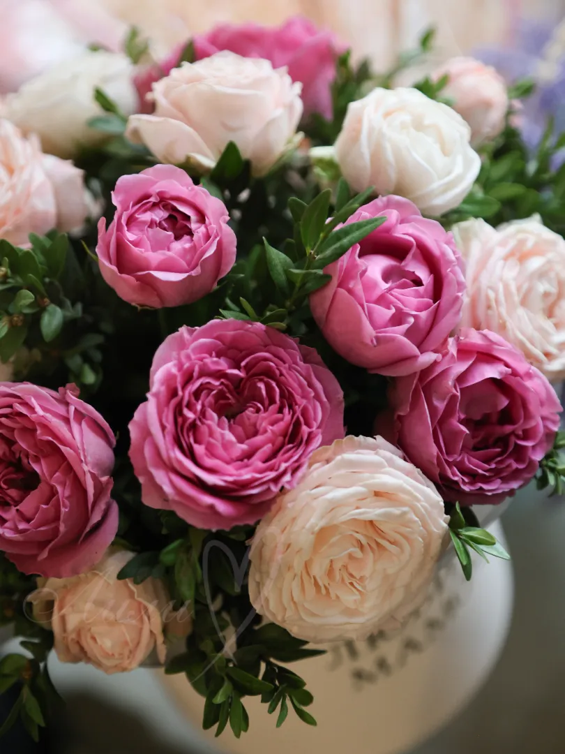 Композиция из пионовидной, кустовой розы создает интересный и многослойный визуальный эффект. Ее яркие оттенки поднимут настроение даже в самый пасмурный день!