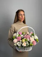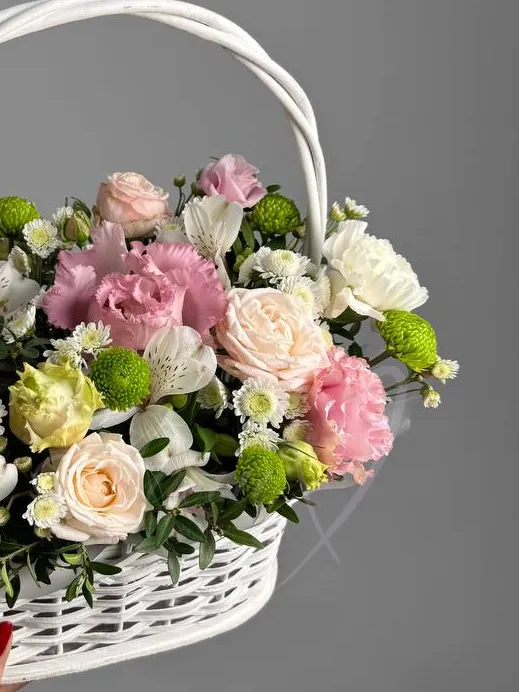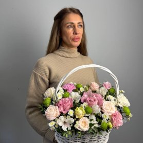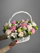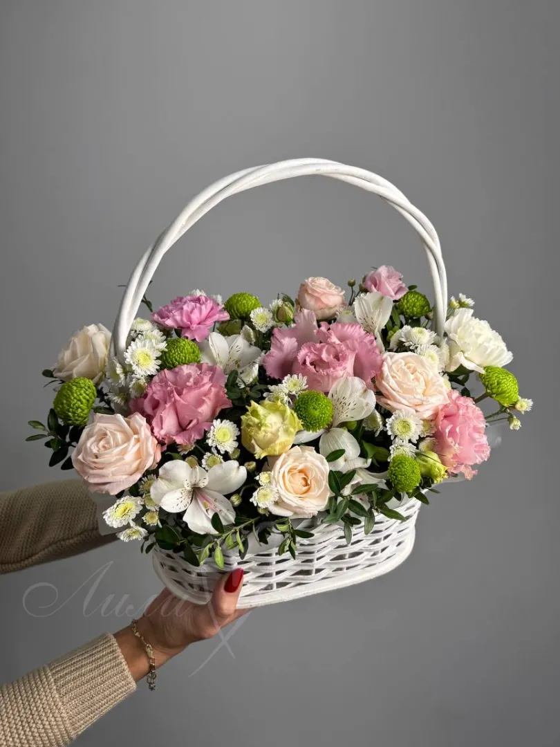 Воздушная композиция с эустомой , хризантемами и прекрасными розами.
