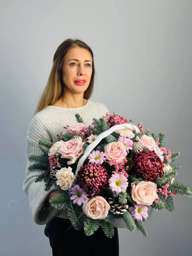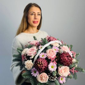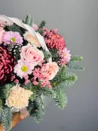 Сборная композиция с самыми стойкими цветам и натуральной пихтой.