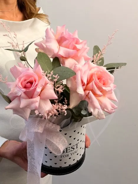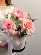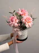 В составе композиции – изысканная французская роза, которая символизирует любовь и уважение. Эвкалипт добавляет композиции объем и приятный аромат, создавая атмосферу уюта.Букет упакован в элегантную шляпную коробку. Подарок в этом исполнении обязательно порадует получателя и запомнится надолго. Закажите его у нас — и подчеркните свою особую заботу и внимание к важным людям в вашей жизни.