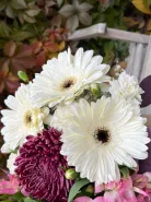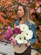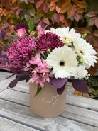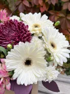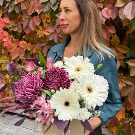 Стильно-осенняя композиция из сочных хризантем и нежных гербер для Вашего торжества.
