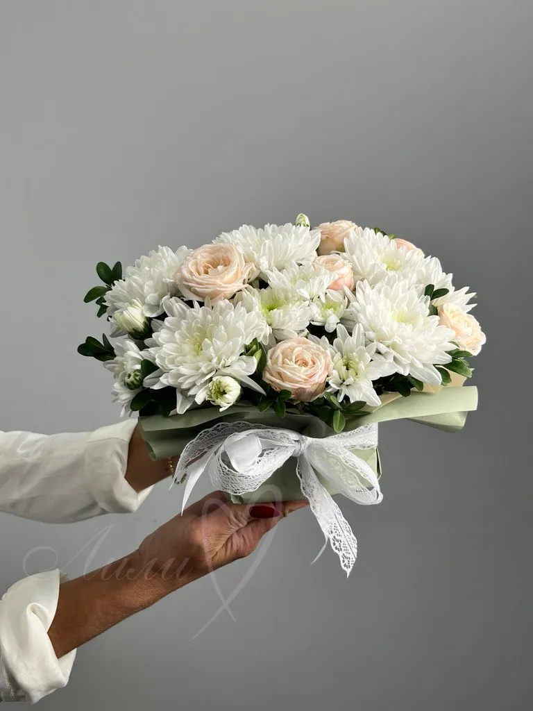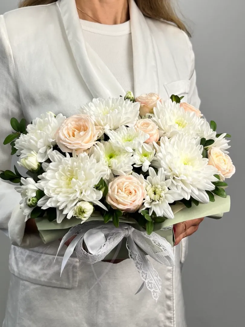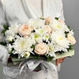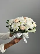 Небольшая композиция - комплимент из хризантем и роз.