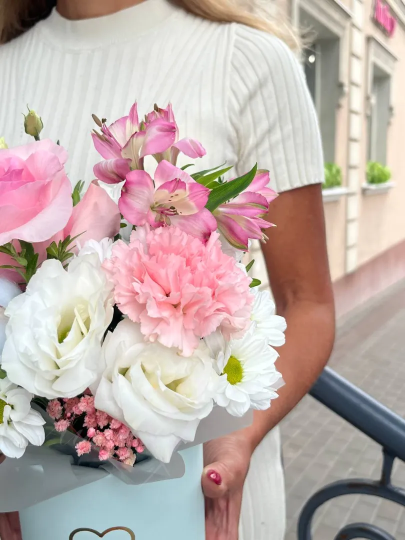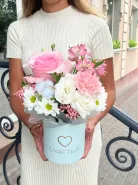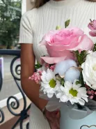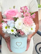 Композиция в шляпной коробке с французской розой розой, хризантемой, альстромерией и эустомой.