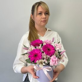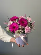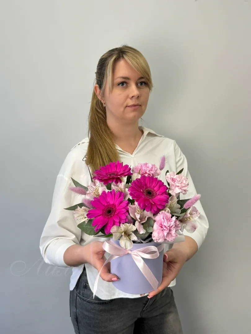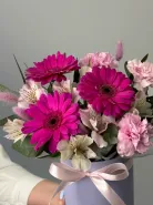 Композиция «Очарование» – это гармоничное сплетение нежности и изысканной красоты. Яркие герберы, словно солнечные лучи, дарят букету позитивную энергию и жизнерадостность. Нежные альстромерии добавляют нотку утонченности и многогранности, их лепестки словно рассказывают тихую историю. Деликатные гвоздики вносят свою особую, узнаваемую элегантность, подчеркивая утонченный вкус. Особую текстуру и загадочность композиции придают высушенные сухоцветы, словно застывшие в вечности. Воздушный пиафлор окутывает букет невесомой дымкой, добавляя ему объема и легкости. Зелень служит идеальным фоном, выгодно оттеняя и подчеркивая красоту каждого цветка. Все это великолепие искусно оформлено в стильную коробку, которая превращает букет в завершенный и элегантный подарок. «Очарование» – это воплощение изысканного вкуса и искренних чувств, созданное, чтобы восхищать.