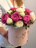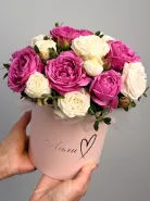 Изящная композиция из кустовых роз, создающая элегантный и романтичный образ. Цветы аккуратно собраны в стильную коробку, которая подчеркивает их изысканность. Этот букет идеально подойдет для особых случаев и станет прекрасным подарком.