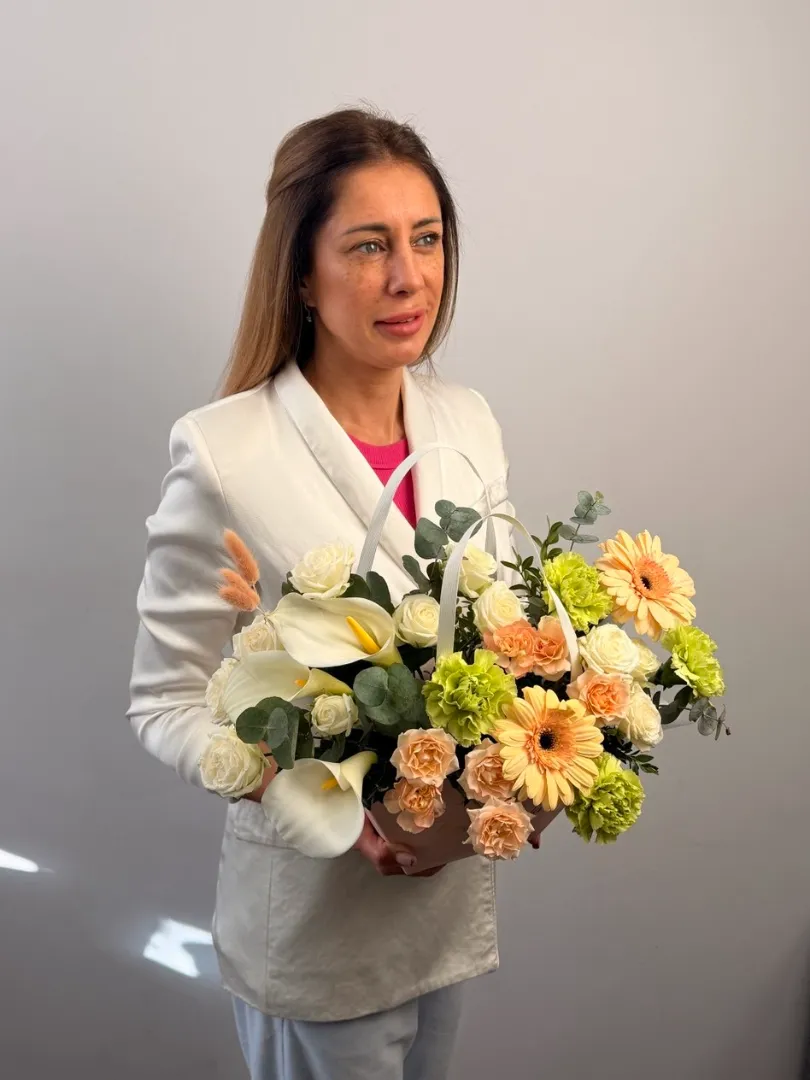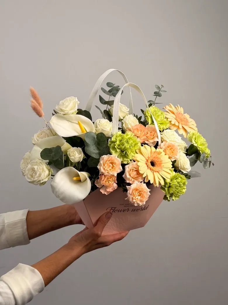 Сборная композиция с каллой, гвоздикой и герберой в удобном кашпо