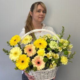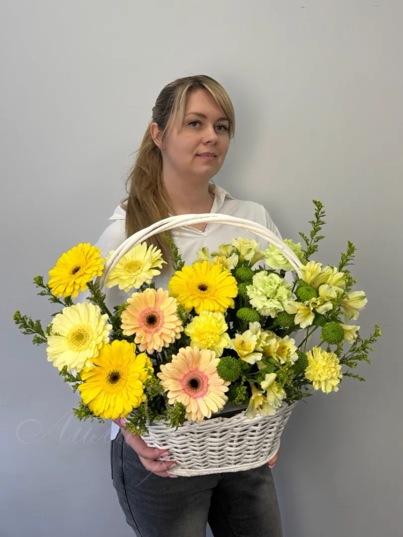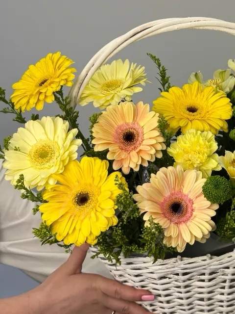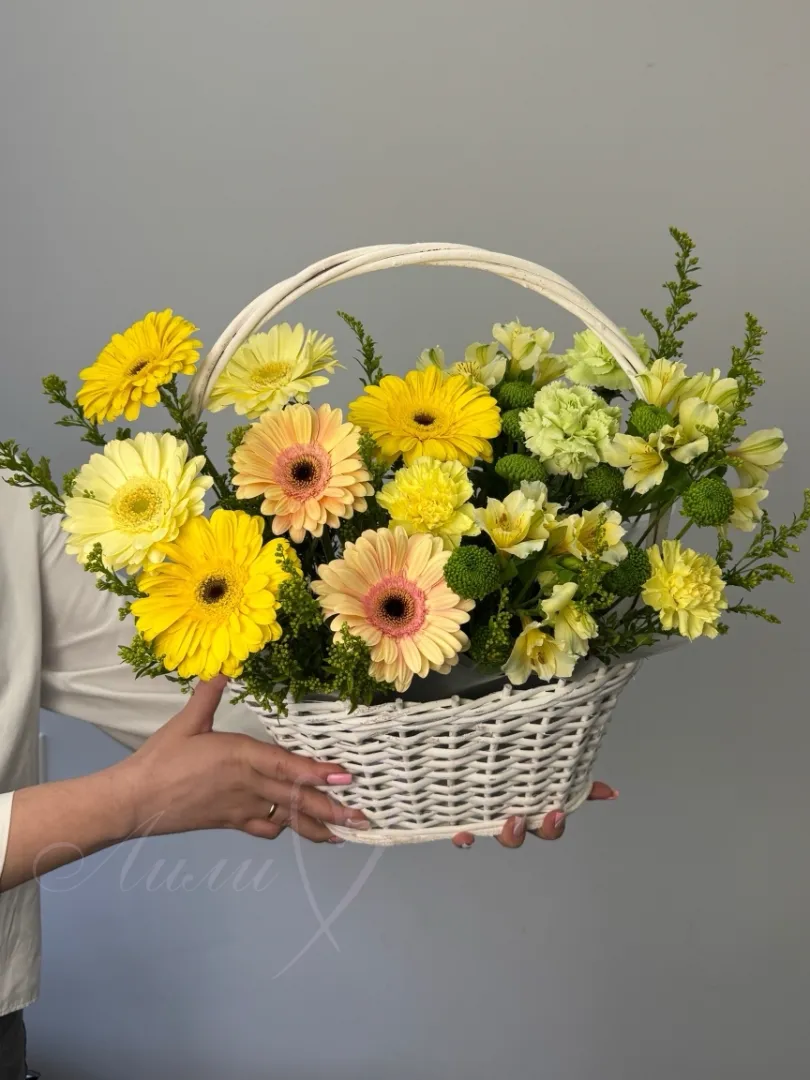 Букет «Лира» – это яркое сочетание солнечных гербер, нежных альстромерий и изысканных гвоздик, дополненное пушистой кустовой хризантемой и воздушным солидаго. Зелень самшита создает фактурное обрамление, а вся эта красота элегантно расположена в стильной корзине. Такой букет станет выразительным подарком, наполненным теплом и очарованием.