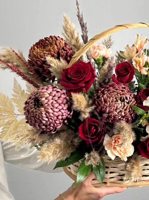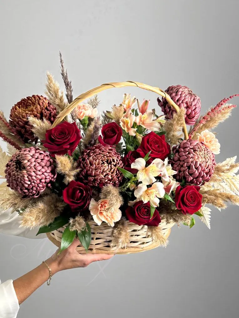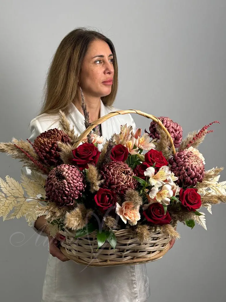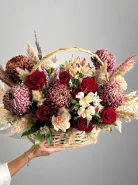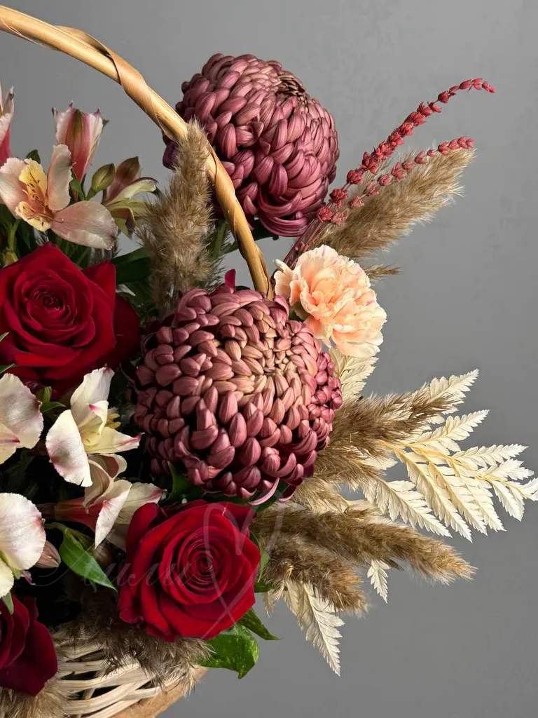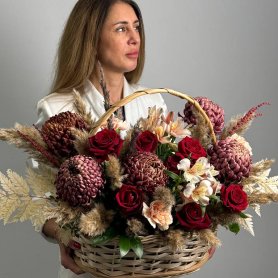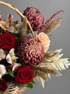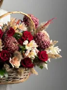 Композиция «Восхищение» — это изысканное сочетание свежих и сухих цветов, созданное для тех, кто ценит красоту и элегантность. В ее составе гармонично сочетаются нежные розы, яркие гвоздики и изящные альстромерии, придающие букету объем и выразительность. Хризантемы добавляют композиции стойкости и красоты на долгое время, а лаванда и рускус создают легкий ароматный фон. Все цветы аккуратно собраны в стильную корзину, которая станет прекрасным подарком или украшением интерьера. Эта композиция отлично подойдет для выражения искренних чувств или для украшения особых мероприятий. «Восхищение» — это гармония красоты и души в каждом лепестке.