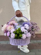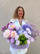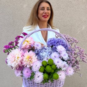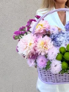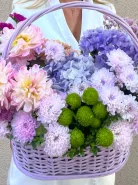Яркая,сборная корзина из гортензии,хризантем и других цветов
