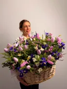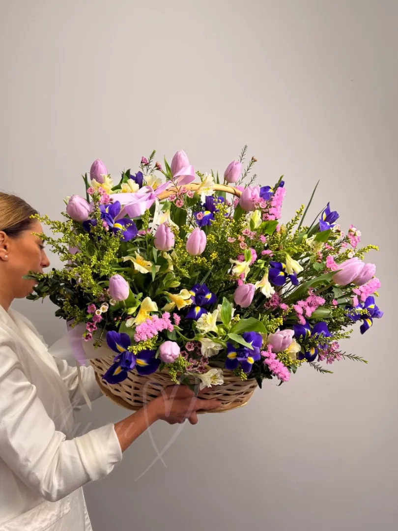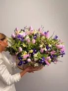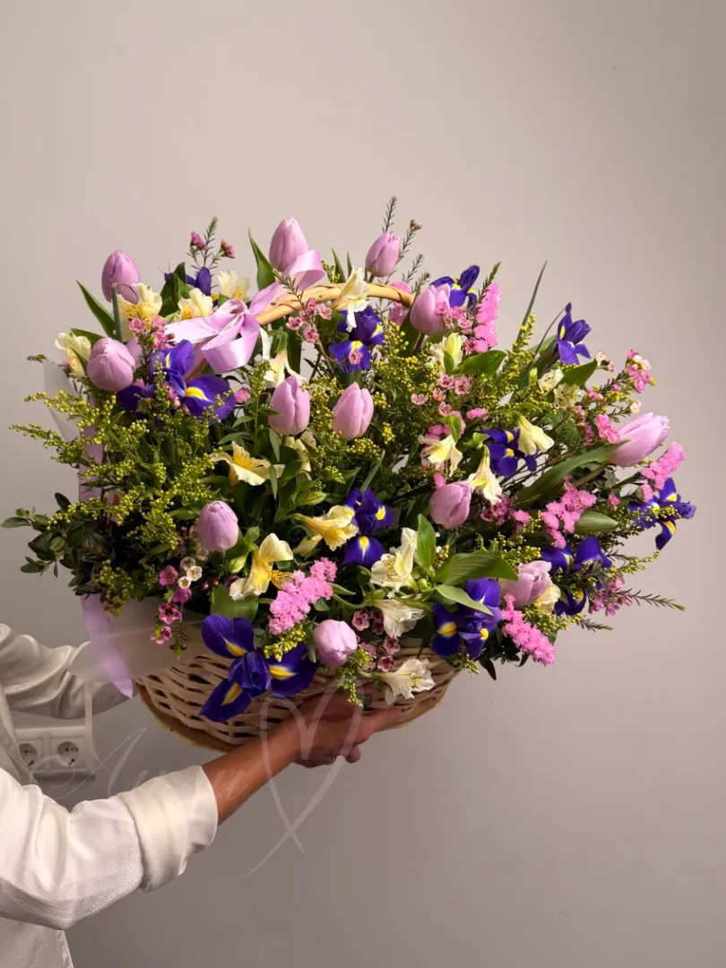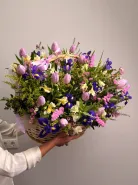 Цветочная композиция «Джаз» — это яркое и элегантное сочетание статиса, тюльпанов, ирисов и альстромерий, дополненное свежестью эвкалипта. Каждый элемент создан для того, чтобы подчеркнуть уникальность.