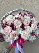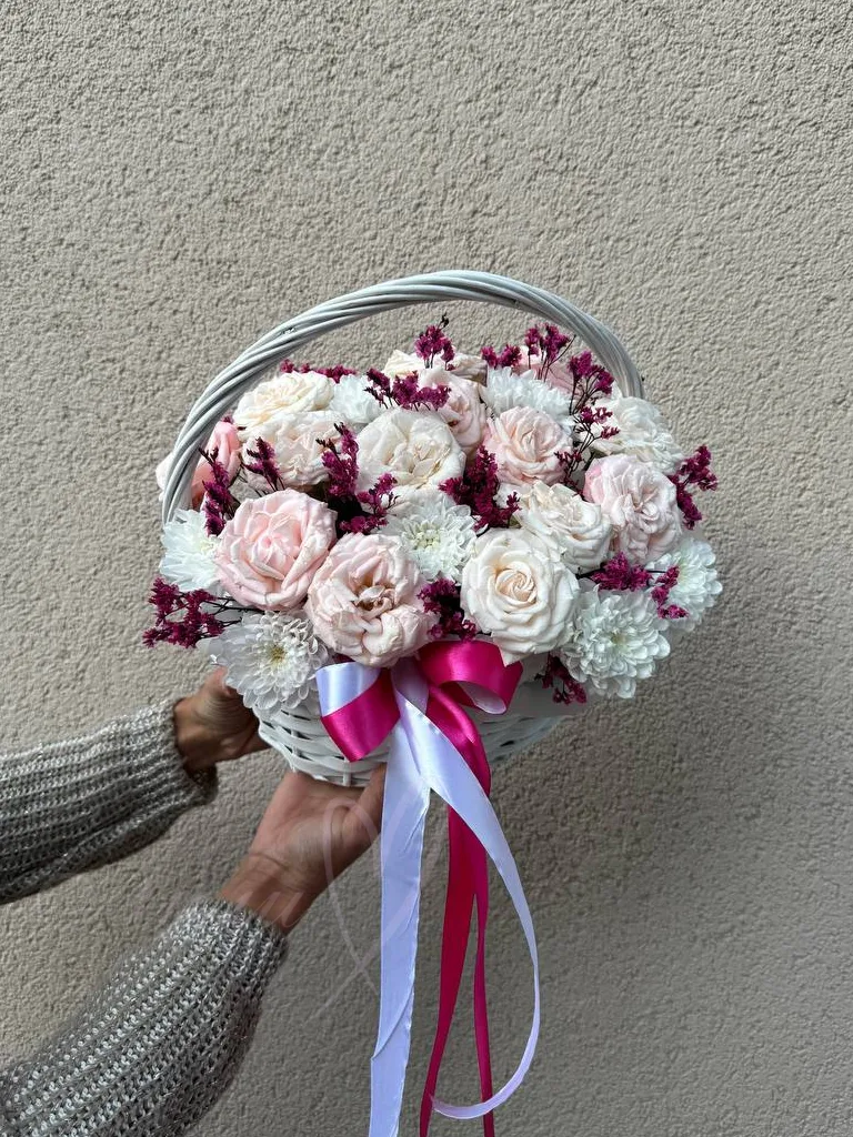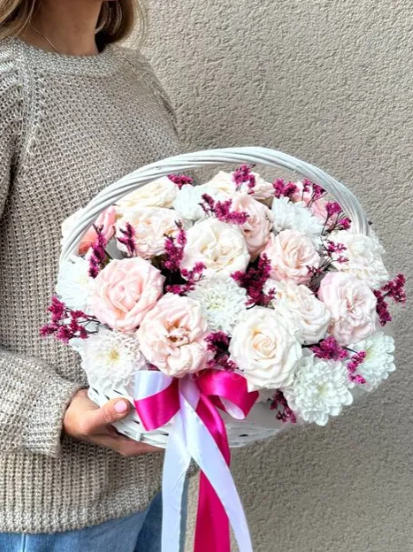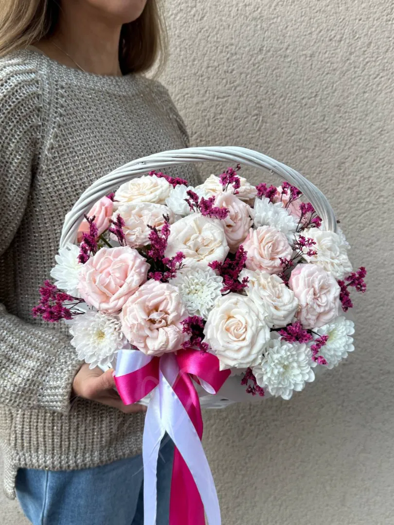 Эта утонченная композиция собрана из ароматных роз и кустовой хризантемы в уютной корзине. Идеальный подарок для особенного человека!