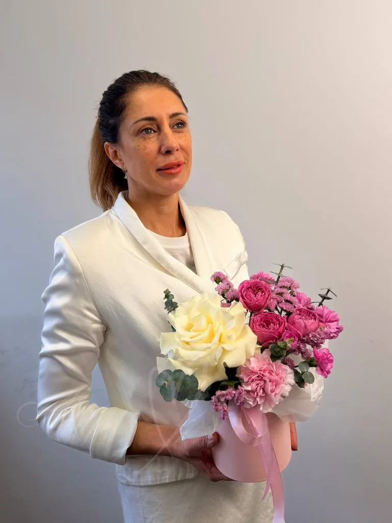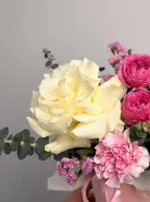 Милая композиция «Мари» – это воплощение элегантности и нежности, где бархатистая французская роза гармонично сочетается с воздушными кустовыми розами и игривыми гвоздиками. Изящная статица и фактурный эвкалипт добавляют композиции глубину и объем. Подарите совершенство и изысканность с композицией «Мари» – идеальным выбором для особенных моментов.