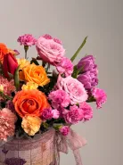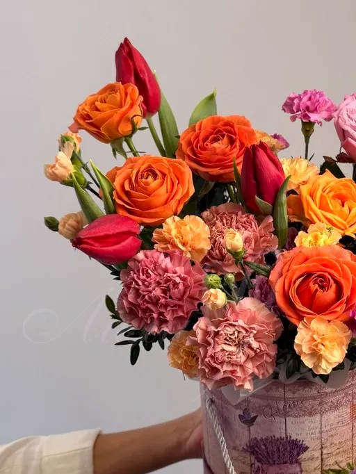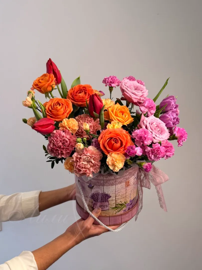 В его составе собраны изысканные розы, нежные тюльпаны и яркие гвоздики, дополненные объемными хризантемами и насыщенной зеленью. Каждая деталь композиции подчеркивает ее свежесть и праздничное настроение. Оформление выполнено в стильной коробке с использованием пиафлора для дополнительной изысканности и стойкости. Такой букет идеально подойдет для любого торжества, подарка или украшения интерьера. Композиция «Яркий взгляд» создает атмосферу радости и красоты, радуя глаз и сердце.
