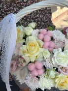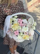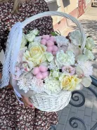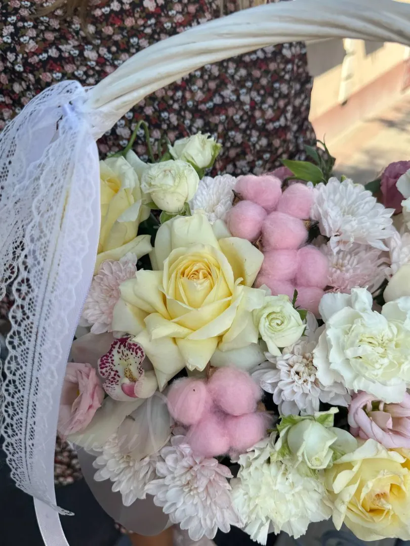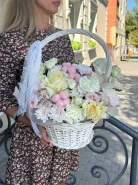 Сборная корзина из роз, орхидеи, гвоздики с добавлением хлопка