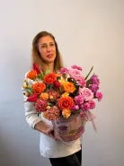 Все филиалыКомпозиция из роз, тюльпанов и диантусов «Яркий взгляд»