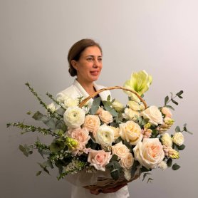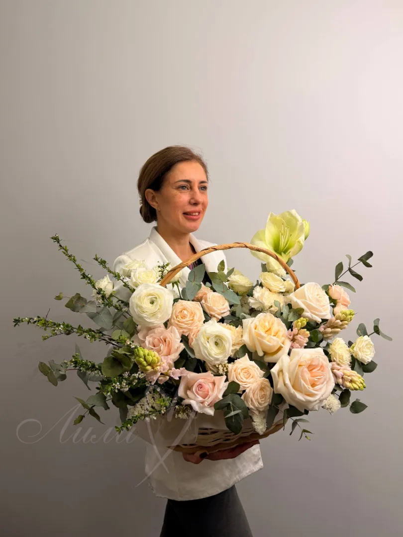 Легкая и изысканная композиция «Мила» — идеальный выбор для любого повода. В ней гармонично сочетаются яркие гвоздики, нежные розы и элегантная гиацинтия, создавая неповторимую атмосферу красоты и уюта. Натуральная зелень и эвкалипт добавляют свежести и объема, а корзина подчеркивает презентабельность букета. Эта композиция обязательно порадует и вдохновит своих получателей своей изысканностью и излучением тепла.