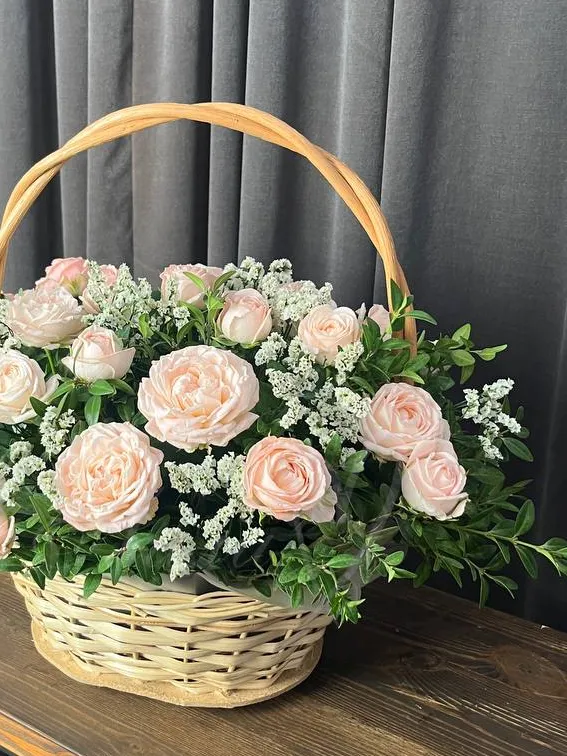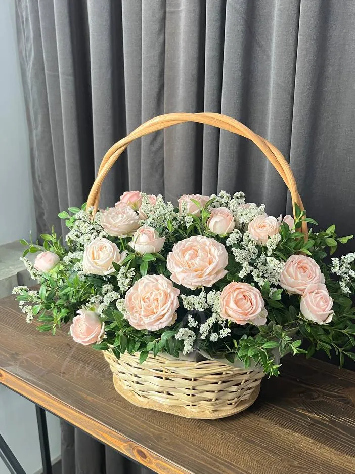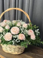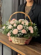 Прекрасная корзина из воздушной эустомы, ароматной гвоздики и альстромерии и герберы.