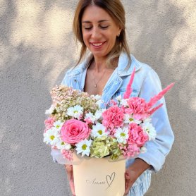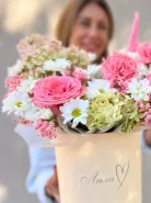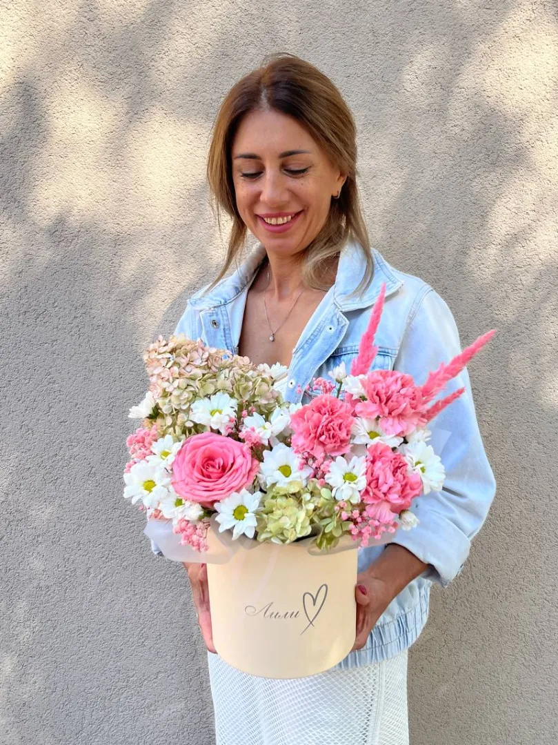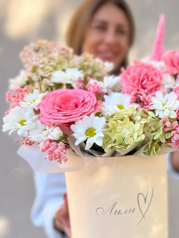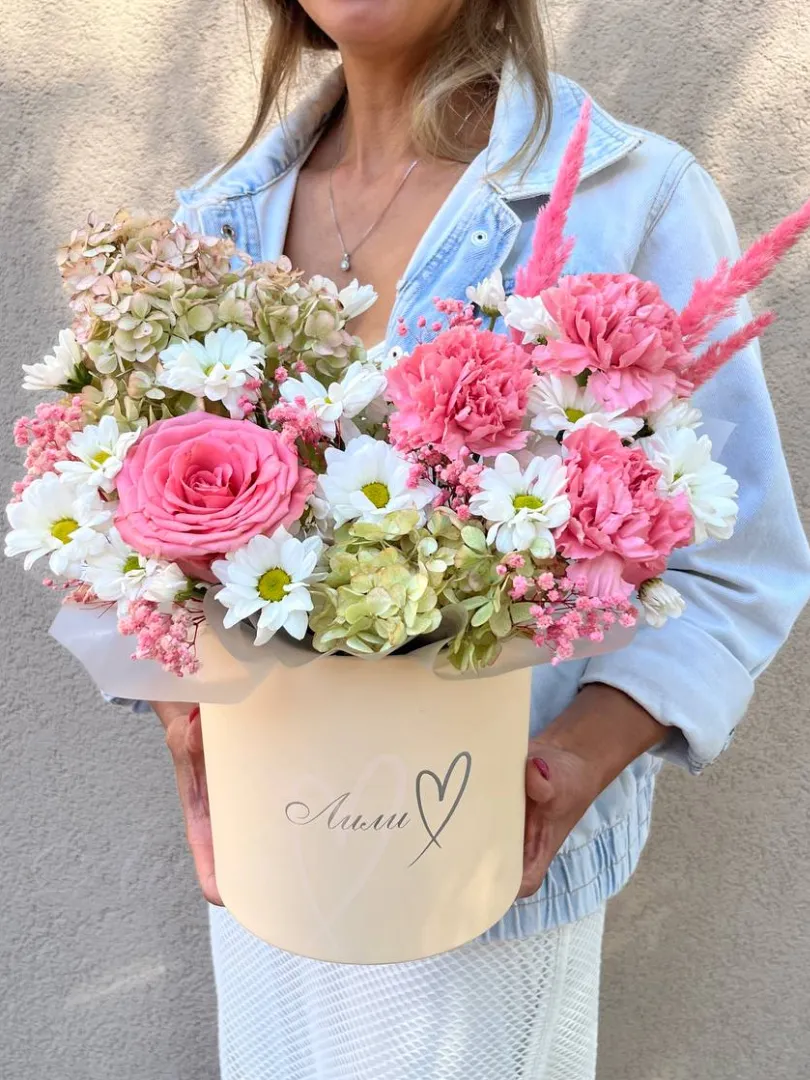 Сочная композиция из гортензии,гвоздик и хризантем.