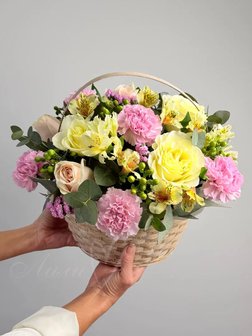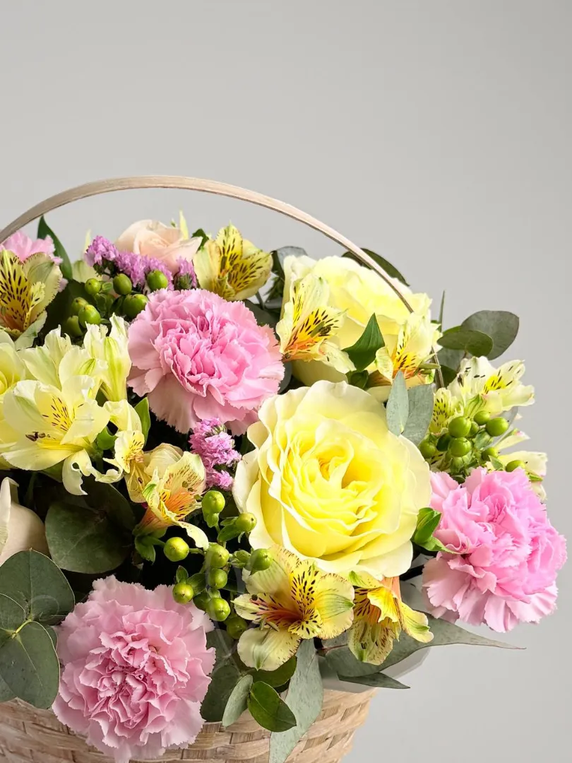 Букет-композиция «Солнышко» создан для тех, кто ценит яркие и теплые оттенки. В его составе собраны насыщенные розы, элегантные гвоздики и изящные альстромерии, которые дополняют друг друга гармонично. Гиперикум добавляет яркости и выразительности, а эвкалипт придает свежести и ароматной нотки. Композиция «Солнышко» подарит тепло и радость каждому получателю.