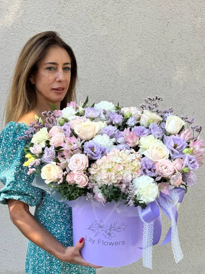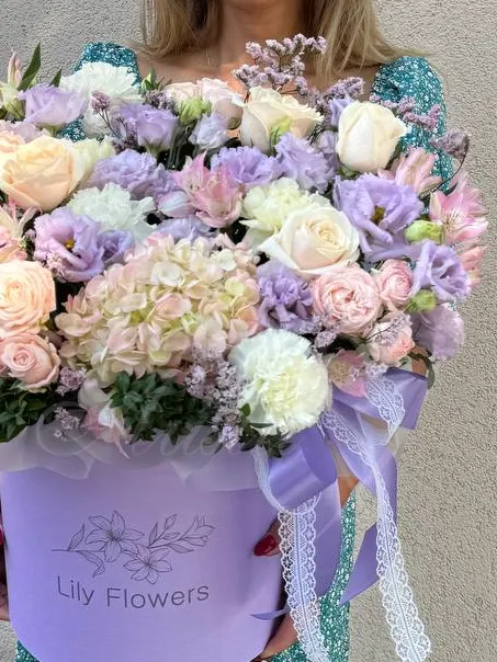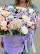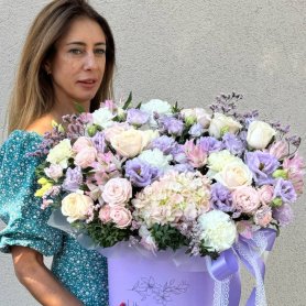 Композиция из нежных цветов-состав:роза,гортензия,лизиантус и другие цветы.