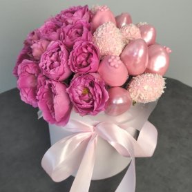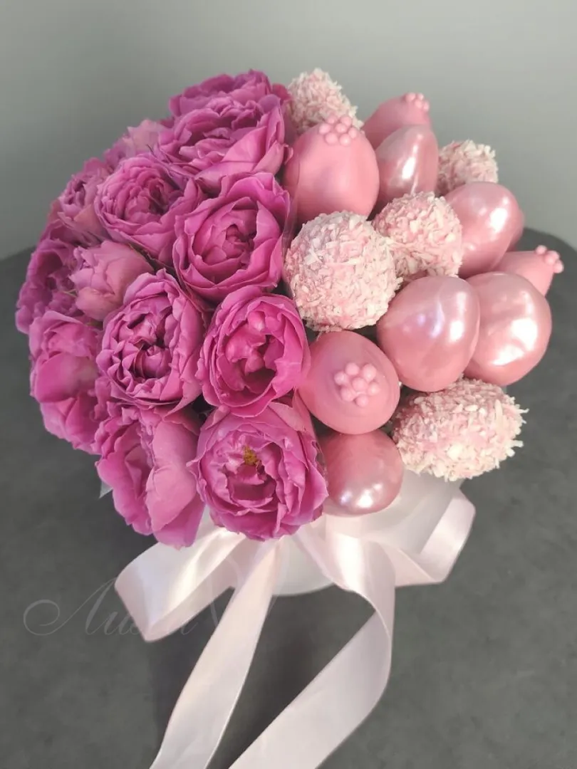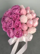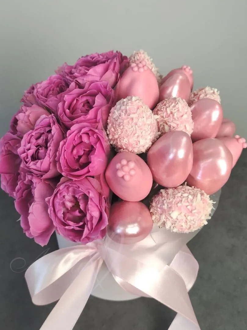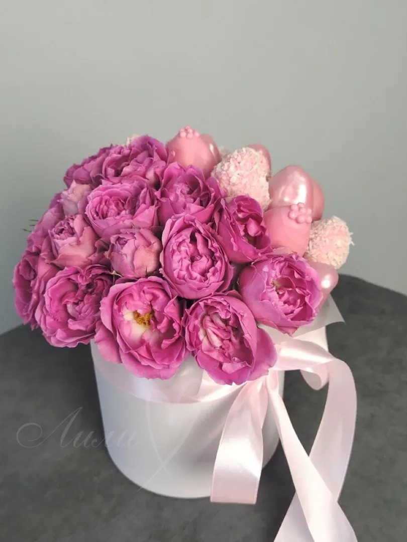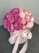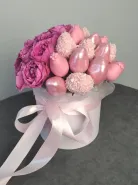 Нежная композиция из кустовых цветов и отборной клубники в нежном оттенке розового с дополнительным декором в сочетании дают очень нежную и романтичную композицию.