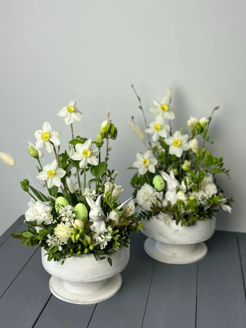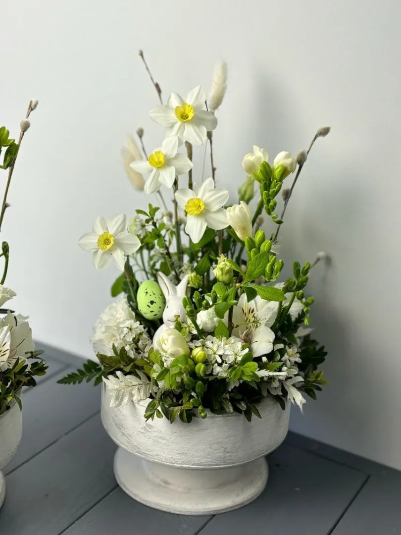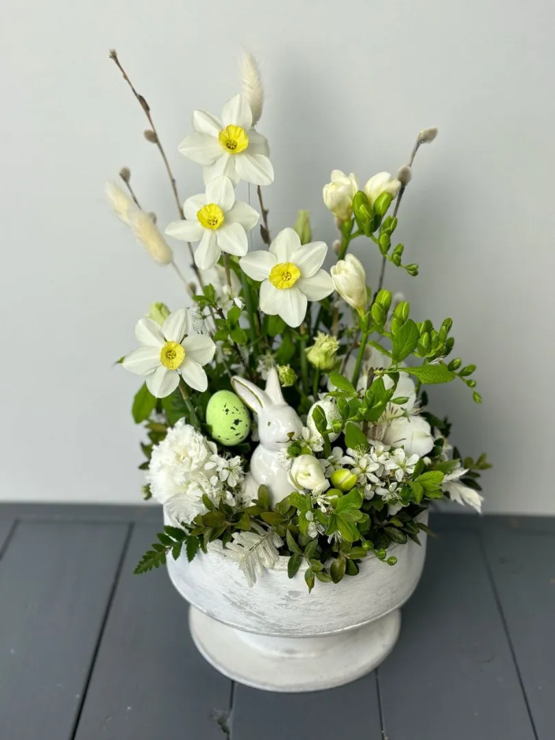 Композиция «Пасхальный кролик» создаст праздничное настроение и украсит любой дом. В ее состав входят яркие и свежие цветы: нарцисс, хамелациум, альстромерия, фрезия и пиафлор. Красиво оформленное в стиле пасхального кролика, оно станет отличным подарком и декором на праздник. Курсор в кашпо подчеркивает лёгкость и радость весеннего настроения.