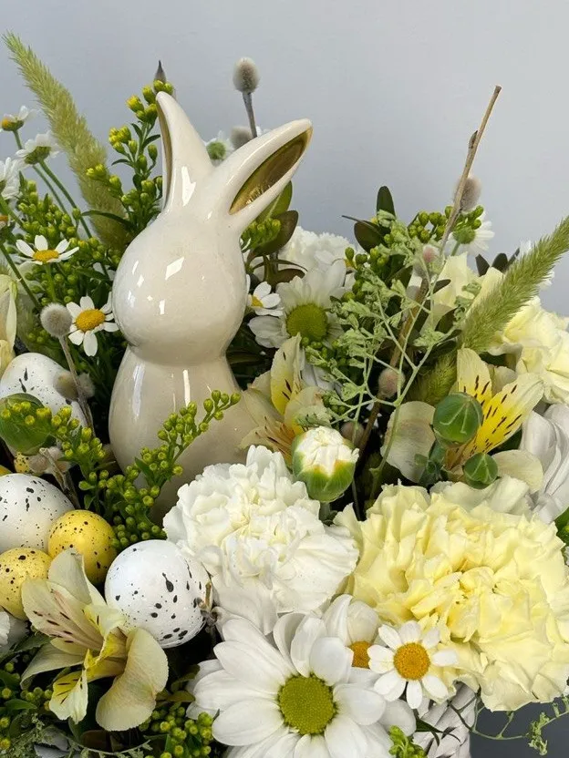 Композиция «Пасхальное утро» изысканно сочетает в себе свежесть и нежность весенних цветов. В её составе — солидаго, кустовая хризантема, альстромерия, гвоздика, пиафлор и аккуратно подобранные ветки в красивой корзине. Эта яркая и живая композиция станет отличным украшением праздничного стола или подарком для близких. Каждая деталь выполнена с вниманием к искусству флористики, создавая ощущение праздника и радости. Идеальный выбор для тех, кто ценит красоту и хочет подчеркнуть важность особого момента.