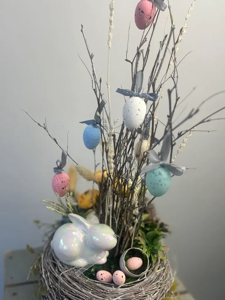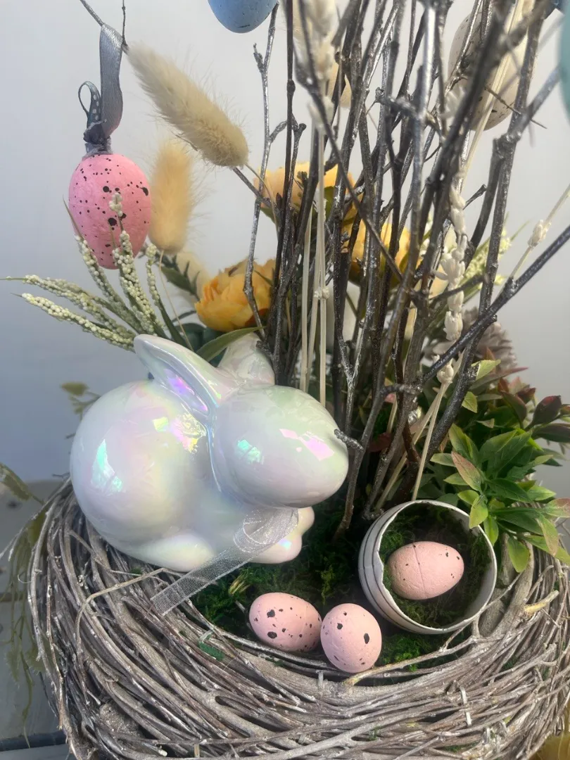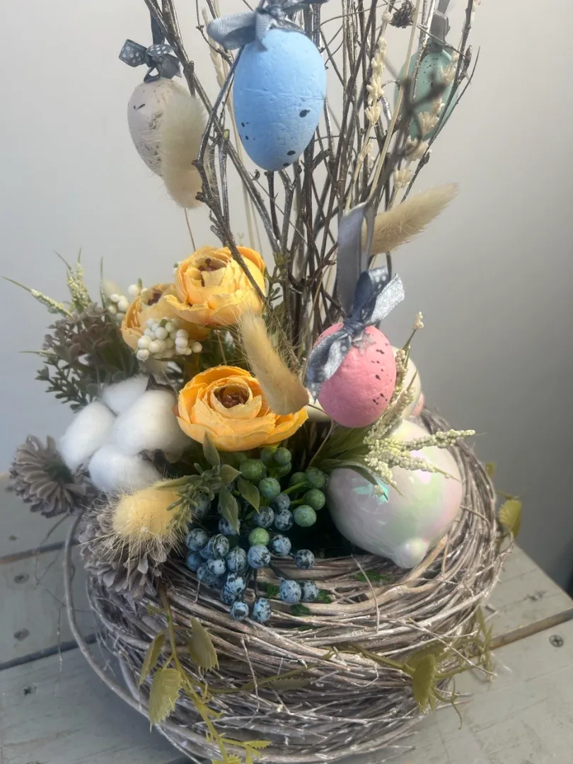 Композиция «Пасхальное гнездо» станет прекрасным украшением праздничного стола, создавая атмосферу уюта, торжественности и пасхального настроения.
