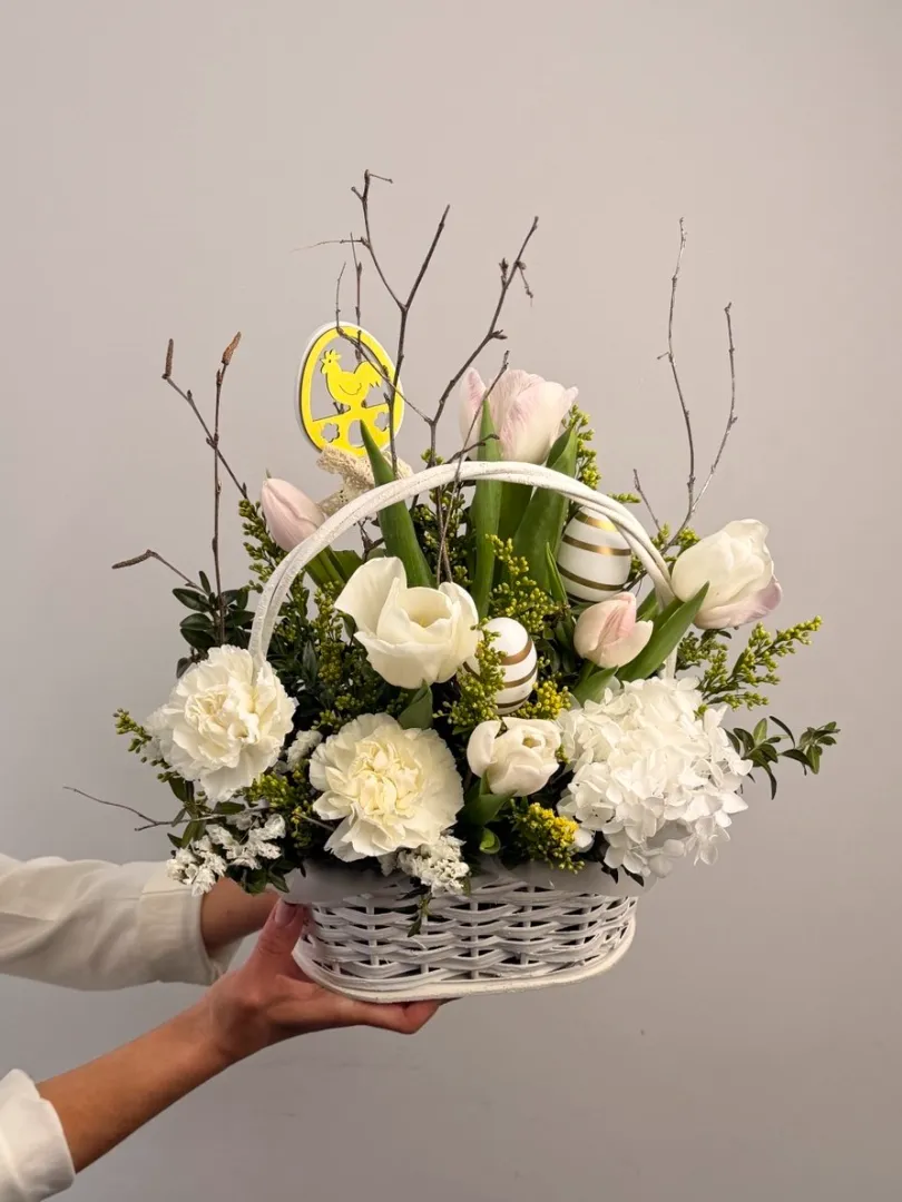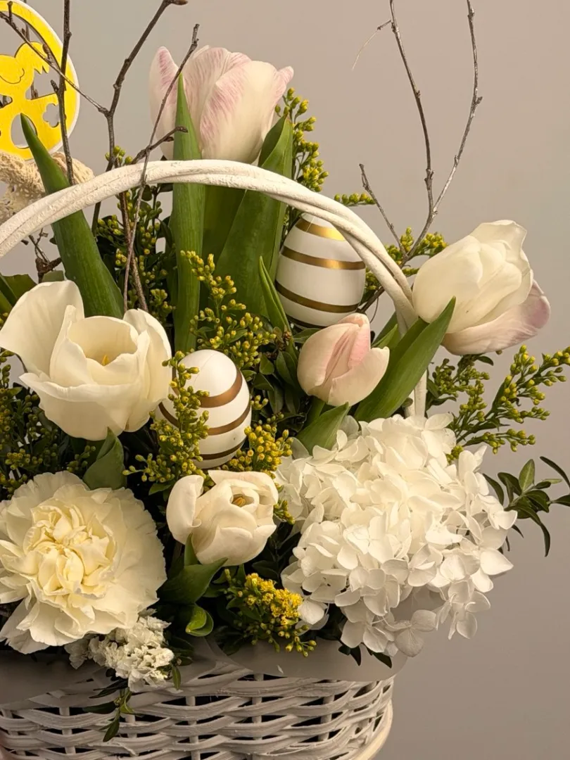 Корзина цветов с элементами пасхального декора украсят ваш праздничный стол и наполнят его светлыми мыслями и ароматом.