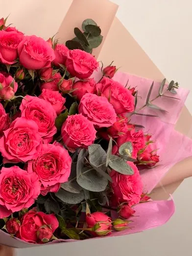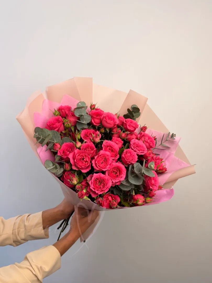 Этот яркий букет состоит из кустовых,пионовидных роз, упакованной в красивую корейскую бумагу. Он передает ощущение утонченности и изысканности, идеально подойдет как прекрасный подарок для особого случая или просто как знак внимания и любви. Чистая и простая красота этого букета наверняка порадует и вдохновит любого получателя.