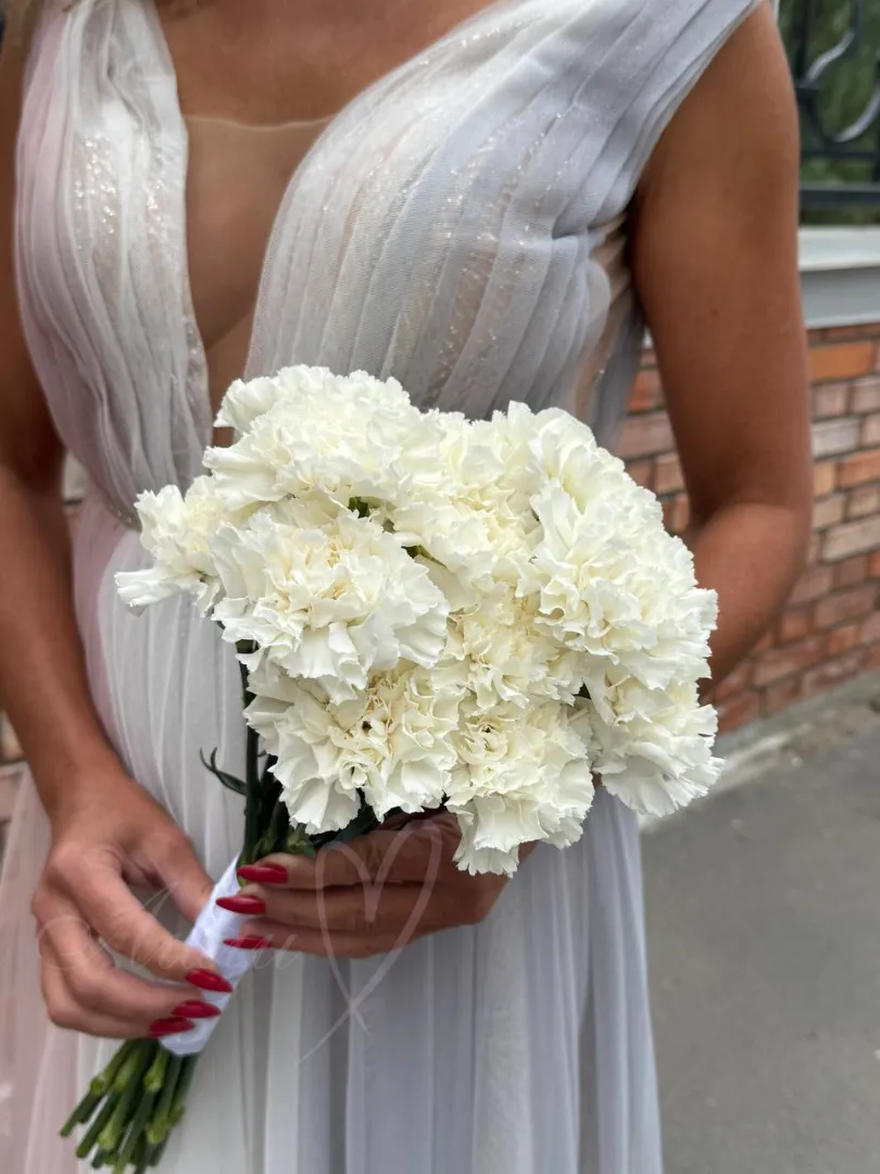 Свадебный кружевной букет из белоснежных гвоздик.