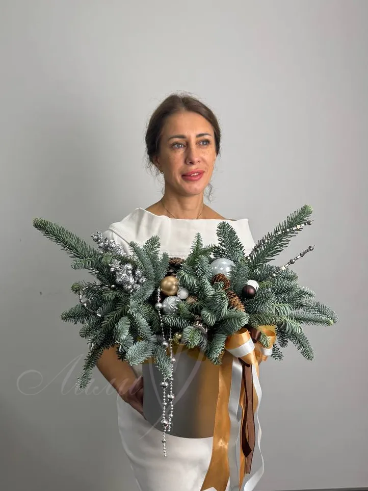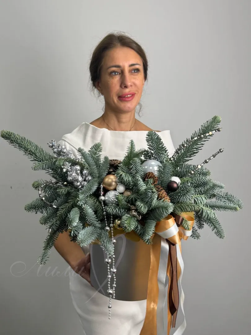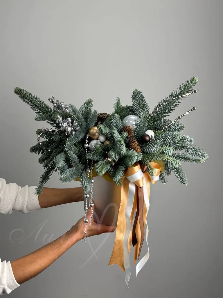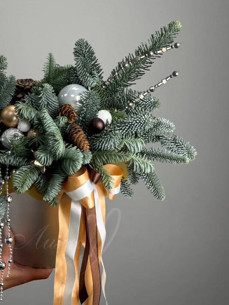 Стильная композиция из натурального нобилиса с новогодними украшениями.