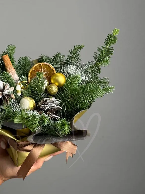Композиция из ароматного нобилиса с новогодним декором в фиолетовом кашпо