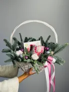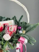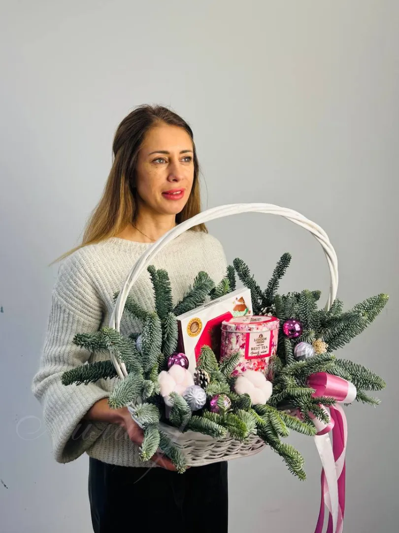 Подарите себе и своим близким частичку новогоднего волшебства с нашей прекрасной композицией из натурального нобилиса с набором из чая и конфет полной тепла и радости.