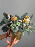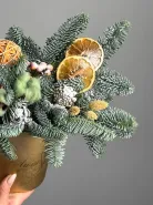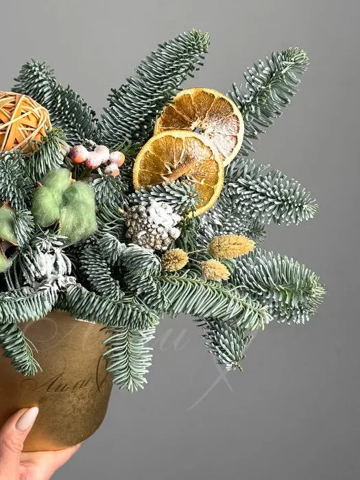 Композиция в кашпо с ветками пихты отлично подойдет для украшения новогоднего стола.