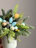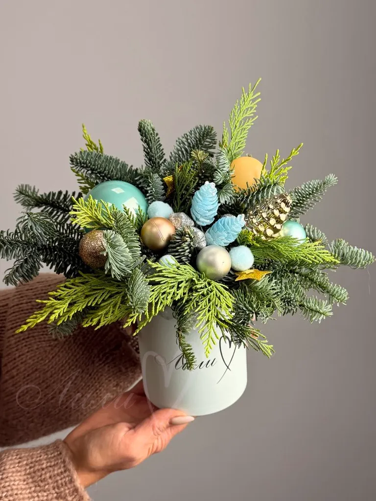 Подарите волшебство Нового года с нашей изысканной композицией «Новогодний день». Роскошное сочетание пихты, новогоднего декора в красивой шляпной коробке создаст праздничное настроение. Идеальный подарок для тех, кто ценит уют и элегантность в праздничные дни.