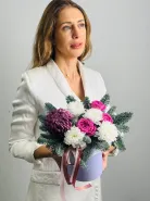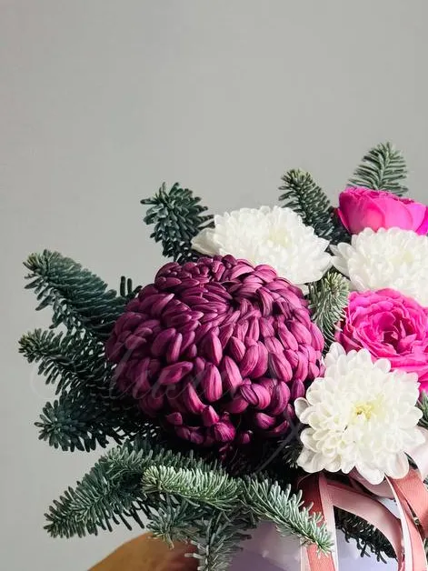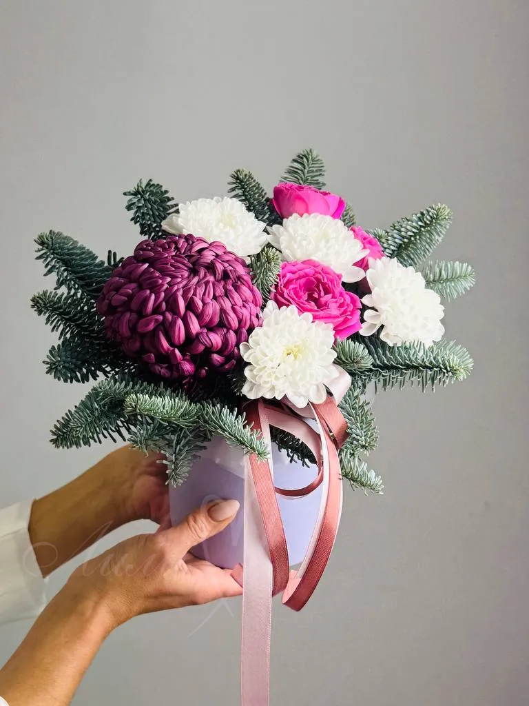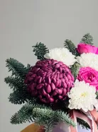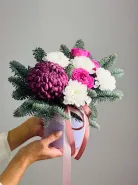 Подарите уникальную атмосферу праздника с композицией «Новогодний презент». Эта яркая и элегантная композиция объединяет в себе изысканные хризантемы, изящные розы и свежие веточки пихты, придающие композиции уютный зимний аромат и нотки новогодней магии. «Новогодний презент» станет незабываемым символом внимания и добрых пожеланий в честь праздника.