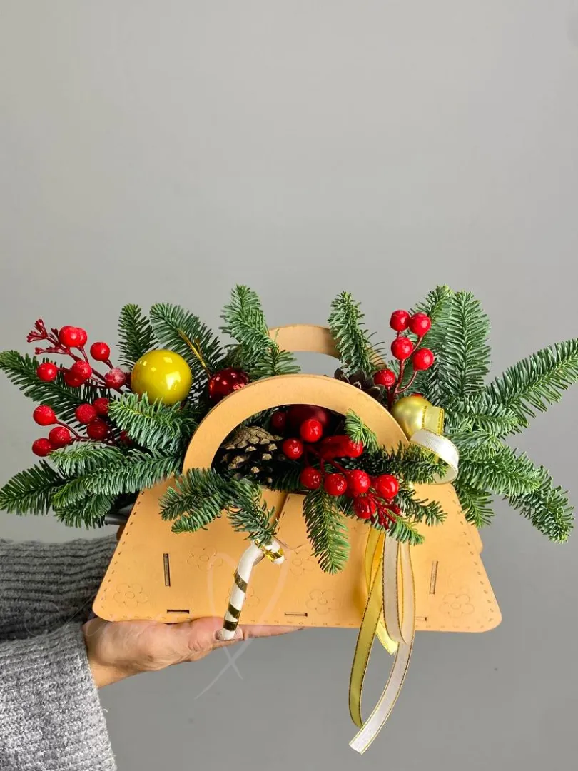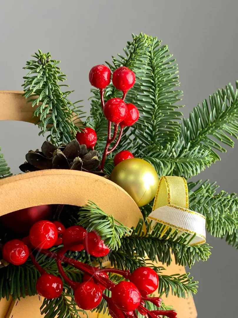 Композиция в кашпо из ароматной пихты с новогодним декором.